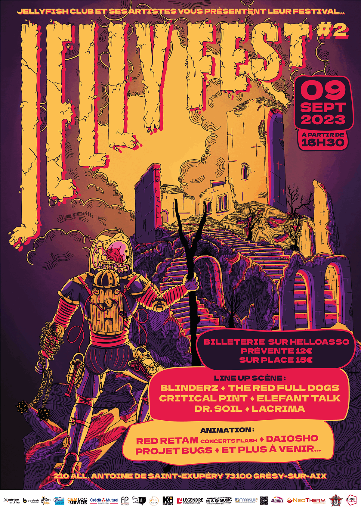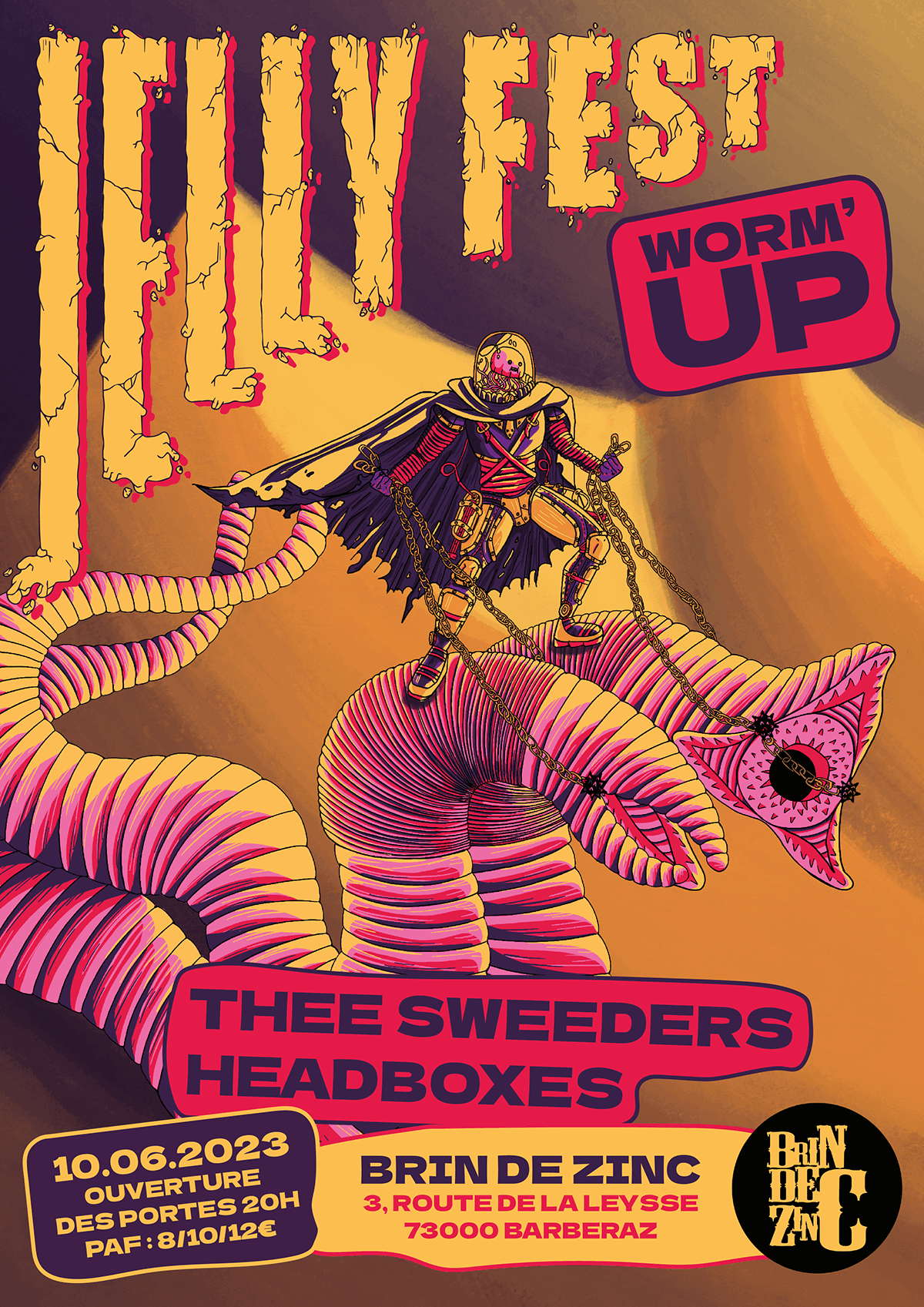 J'ai a eu la chance de collaborer une nouvelle fois avec le Jellyfest, un festival de rock savoyard, pour la deuxième éditions de celui-ci. J'ai également travaillé sur le visuel du Worm'up qui a eu lieu en juin en 2023.